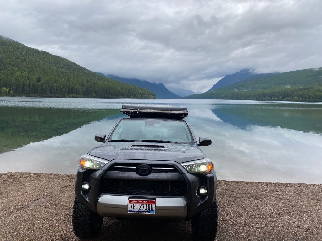 I woke to the sound of rain dancing on the top of my rooftop tent. I climbed down my ladder and pulled on my rain jacket. Even though the rain was steady, the temperature was mild. I was glad to see the smoke was gone. Instead it was replaced by low hanging clouds. Not threatening ones. Ones that gave a sense that Autumn was here. I spent the morning hiking the edge of the lake. Kitnla Lake is a clear beautiful body of water in the Northwest corner of the park. I pulled down and latched my tent and headed toward Bowman Lake 20 miles over a pretty rough dirt road. Not treacherous, but enough to keep the tourists away this time of year. Bowman is just as wonderful as it’s smaller sister Kitnla.