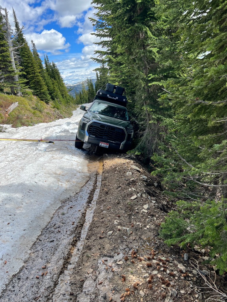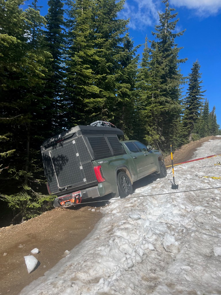 As I bogged down to a stop in the soft snow I stopped to assess the situation. In order to get a proper evaluation I would need a beer. I opened the side door of the Alu-Cabin camper and reached in to my well placed cooler. I positioned the cooler next to the drivers side in front of camper for just this reason.